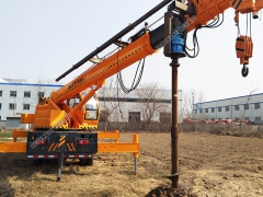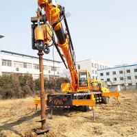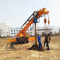 全部采用液压控制,操作方便,单人即可完成操作,钻孔速度快,在普通黄粘土层最快钻孔速度为47秒,钻孔直径为600mm,深度为3米;在硬土层例如:路基,地基,保证没有大块石头的情况下钻孔速度为2分钟,冻土层可配冻土钻头钻孔速度为5分钟左右。 钻头安装在第二节吊臂上,实现了跨沟跨距钻坑。本机可旋转360度,在主体不动的情况下可旋转钻坑吊杆,大大提高了工作效率。 为前置式钻孔,比其他厂家后置式钻孔机,操作简单。 采用554或804拖拉机,马力大,动力充沛。钻孔无需清土,一个人即可完成工作,钻到深度后,可靠吊臂提起,土都附着在螺旋叶片上,很少有回落。提起后只需将钻杆正反转动记下土就会自然落下。 可以实现单人操作,车到孔成,随钻随走。大大提高工作效率。 采用四轮驱动拖拉机改装而成,越野性能好。大大摆脱了普通吊车收地形限制的局限性。